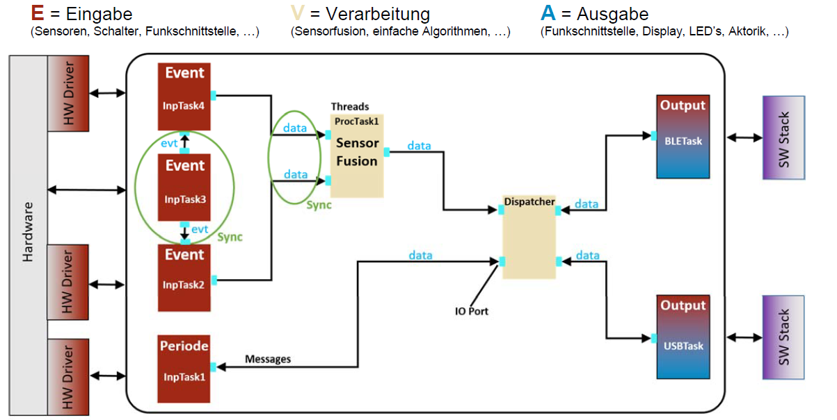 Die Eingabe (in der Abbildung rot dargestellt) erfolgt entweder mechanisch über einen Schalter bzw. Button oder über Sensoren (z.B. Bewegung), welche normal ausgelesen werden können oder einen Interrupt auslösen. Natürlich kann die Eingabe auch über eine funk- oder kabelgebundene Schnittstelle erfolgen, welche im gleichen Zug auch die Ausgabe sein kann. Als Funk bietet sich z.B. der Funkstandart Bluetooth oder Bluetooth Low Energy an. Die durch die Eingabe-Tasks entstandenen Events, können synchronisiert werden und gegenseitig auslösen. In der Abbildung ist dies z.B. beim InpTask3 zu sehen. Sobald der InpTask3 ausgelöst wird, löst dieser auch den InpTask2 und InpTask4 aus. Die Eingabe-Tasks können zu großen Teilen voll generiert werden.